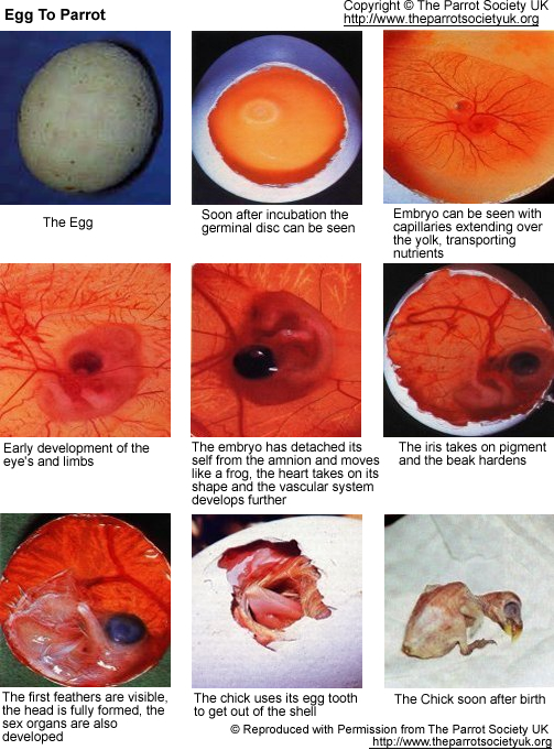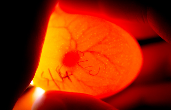 La presencia del embrión es evidente a partir de los 10 días de puesta. El embrión se localiza en la zona aguda del huevo, como una mancha oscura y se observan las venas a lo largo de este, como anaranjadas. En caso de huevos infértiles o no desarrollados simplemente se ve transparente. Si observamos una mancha oscura, pero no hay presencia de vasos que hayan sido observados previamente puede tratarse de una muerte embrionaria.