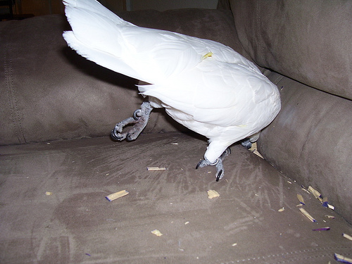 Cuando estan en celo, en ocasiones quieren hacer nido. No dudarán en hacer un agujero en el sofá o roer el mobiliario para su fin. Hay que tener mucho ojo con un ave en celo suelta por casa.