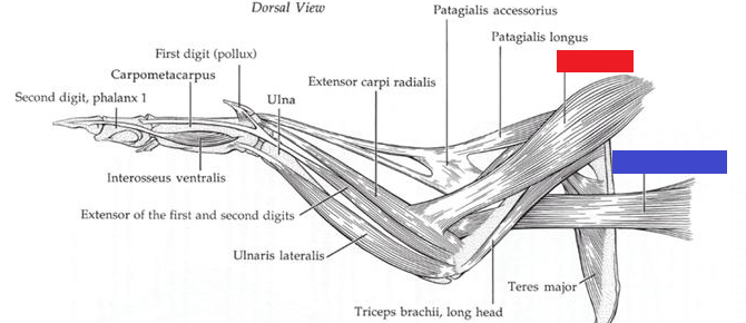 Cuanto a la sutura distal, al igual que en la proximal con el ave en decubito esternal, se sutura la piel del carpo al cálamo de la pluma más externa del alula. El nudo siempre se coloca medialmente para evitar que el ave se lo toque.