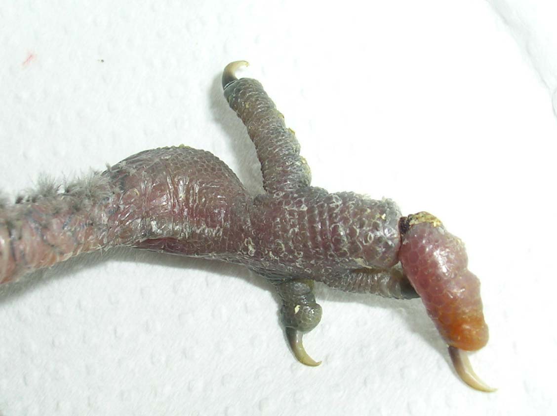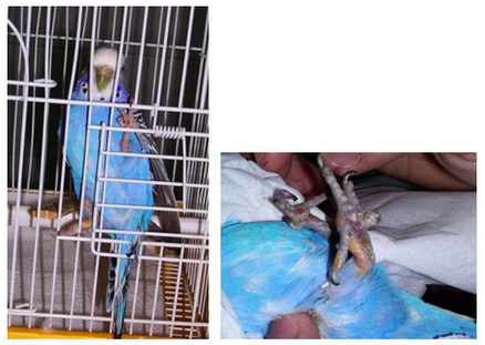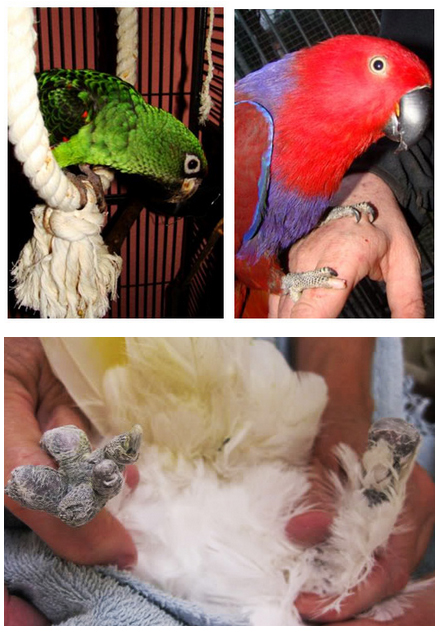 Pododermatitis: las superficies de apoyo inadecuas, la obesidad así como los traumatismos pueden originar inflamaciones, lesiones y heridas que actúen como vía de entrada para los patógenos. Son frecuentes las infecciones por salmonellas y estafilococos. El tratamiento dependerá de la gravedad de la herida. Si ésta es leve bastará con la limpieza de la herida y la aplicación de un antiséptico o crema antibiótica con antiinflamatorio. Si la herida lo requiere se puede vendar, pero hay que recordar que las psittaciformes poseen un robusto pico en forma de gancho con el que desmantelarían fácilmente el vendaje. En este caso se utilizaría un collarín isabelino que impidiera al ave el acceso al vendaje. En los casos muy graves puede ser necesaria una intervención quirúrgica para eliminar el tejido dañado o incluso la amputación.