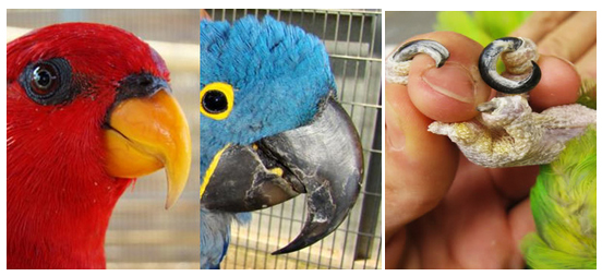 Las patas de las aves están adaptadas a diferentes funciones, en el caso de los loros la disposición de los dedos les permite, desplazarse trepando y manipular los alimentos. El ave está utilizando sus patas en todo momento, ya que incluso le sirven de apoyo cuando está durmiendo. Cualquier alteración en las patas les provocará gran nerviosismo que se traducirá en un deterioro de su salud.