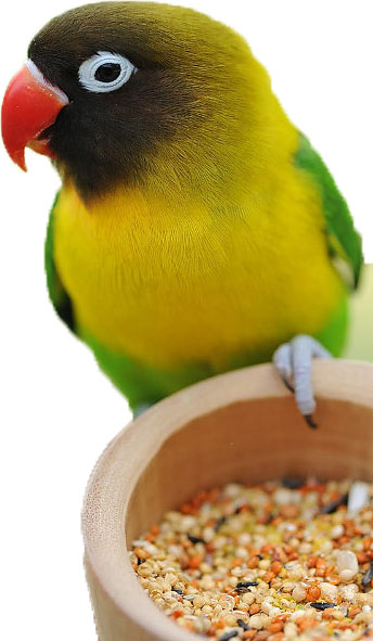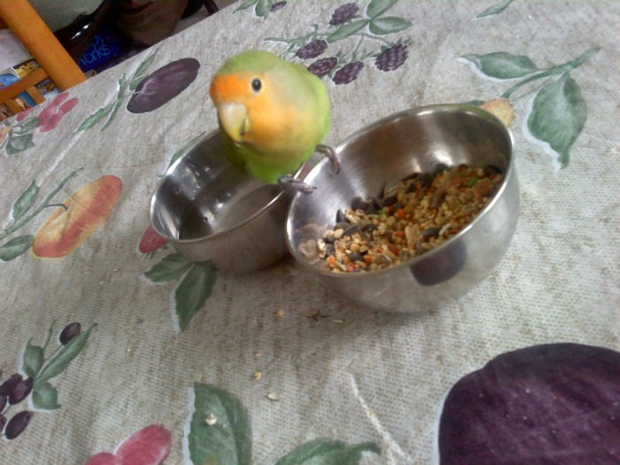 1 cucharada de postre a elegir entre pienso específico o mixtura de semillas(sirven la de cotorritas australianas de Versele-laga, la gropar de Kasper, la de Hagen, etc.) Si tenéis que elaborarla vosotros, dad predominio a cereales, en especial mijo, sorgo, avena, arroz integral… y añadid unas cuantas pipas de girasol, alazor, etc.