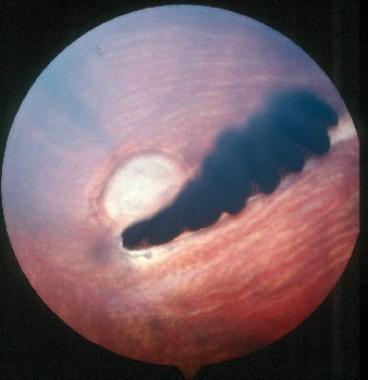 El hallazgo más relevante durante el examen del fondo del ojo es el pecten . El pecten se encuentra normalmente en la zona temporoventral. En la base del pecten , una delgada línea blanca que rodea su perímetro representa la periferia del disco óptico