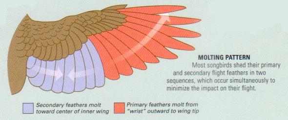 La muda se inicia con la pérdida de una pluma. En el lugar de dicha pluma, el folículo crea una nueva. Sin embargo una pluma que se ha roto pero no se cae, no estimula el crecimiento de una nueva.