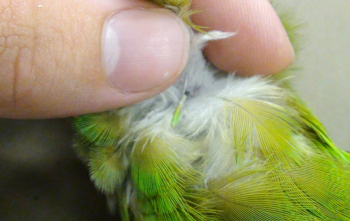 La presencia de muchas plumas en el fondo de la jaula casi siempre significa una muda, pero en ocasiones puede ser causado por automutilación. En ese caso podremos ver lesiones en la piel del ave, sangre en las plumas o restos de piel.