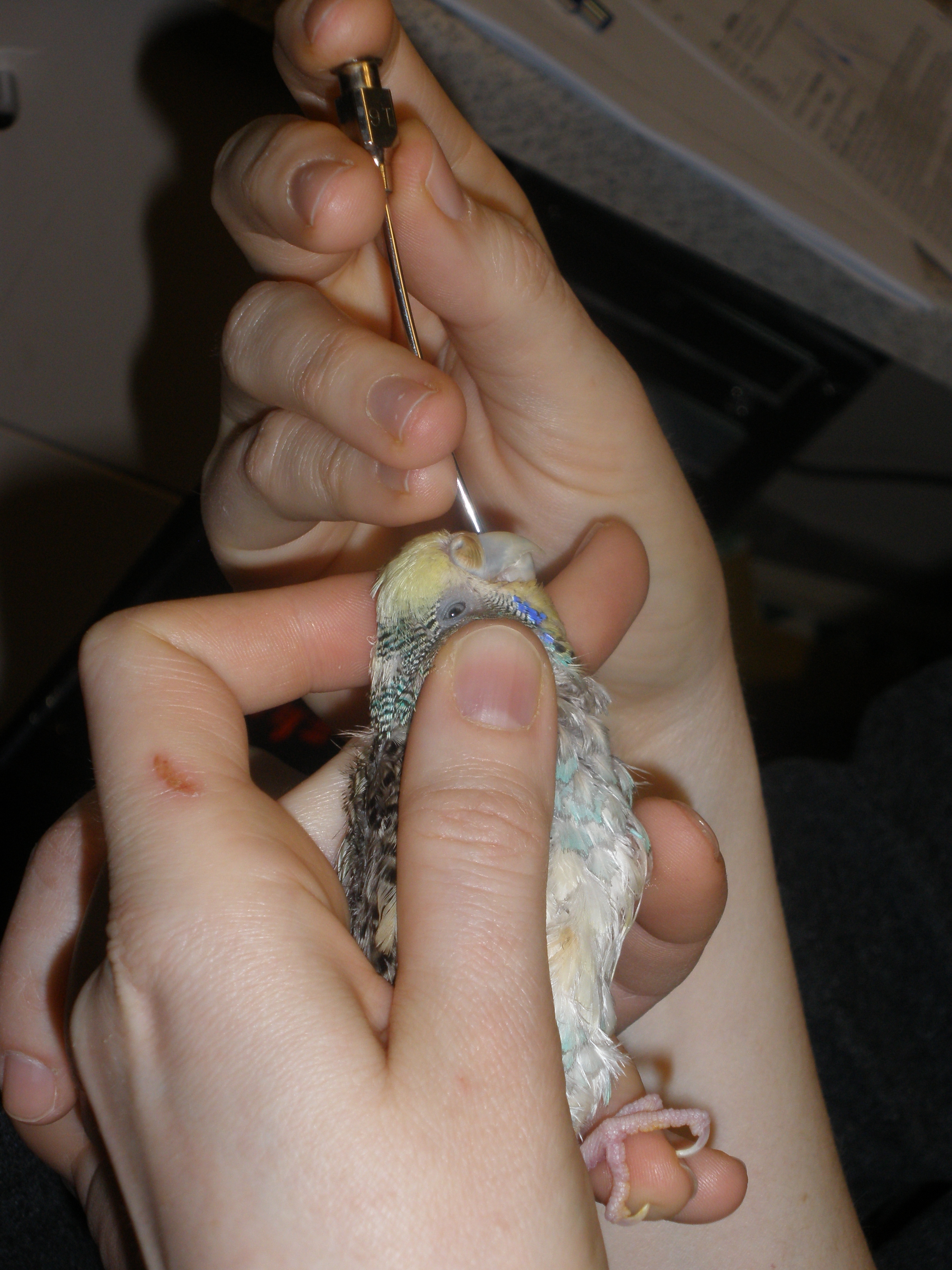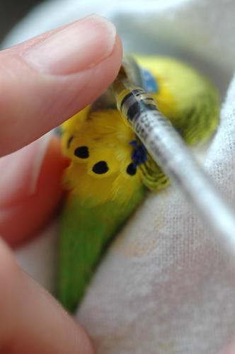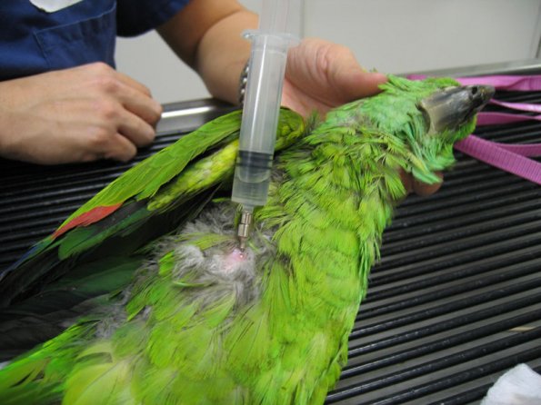 La administración parenteral es la menos frecuente, pero en algunos casos (como en el caso de la psitacosis) puede ser necesaria. Las inyecciones suelen ponerse intramusculares en la pechuga, raramente subcutáneas en el pliegue de la pierna. Siempre será el veterinario quien nos de las pautas y nos enseñe como pinchar al ave.