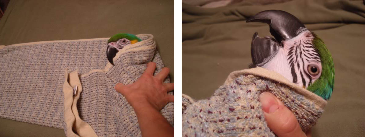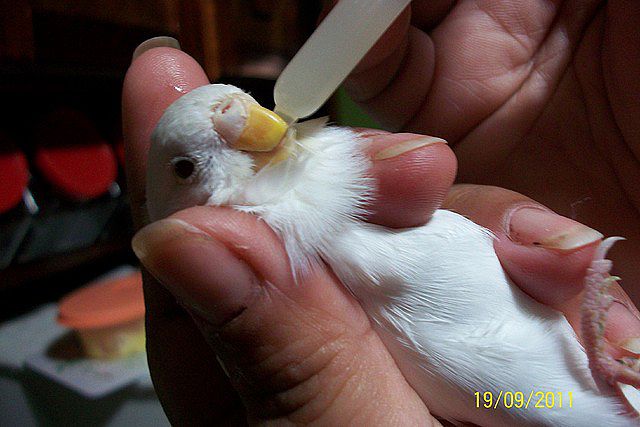 Para administrar medicación vía oral, se sujeta el ave con firmeza y se deposita el medicamento en el interior del pico. En las aves mansas criadas con papilla y acostumbradas a la jeringuilla, se puede mezclar y administrar con papilla siendo menos traumático para ellas.