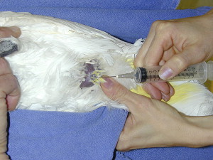 La historia clínica también es importante. Deben ser hembras, con comportamiento de anidación en época de cría. Aunque la ascitis no está presente en el 100% de los casos, suele ser un síntoma muy típico y que nos puede dar muchas pistas al poderse cultivar. El líquido puede ser inflamatorio o no y puede haber sepsis o no. Esto puede evidenciarse en una citología del mismo, donde podemos observar células de grasa, heterófilos, macrófagos, linfocitos con o sin bacterias. Esto nos puede dar una idea del tipo de cuadro que sufre el ave.