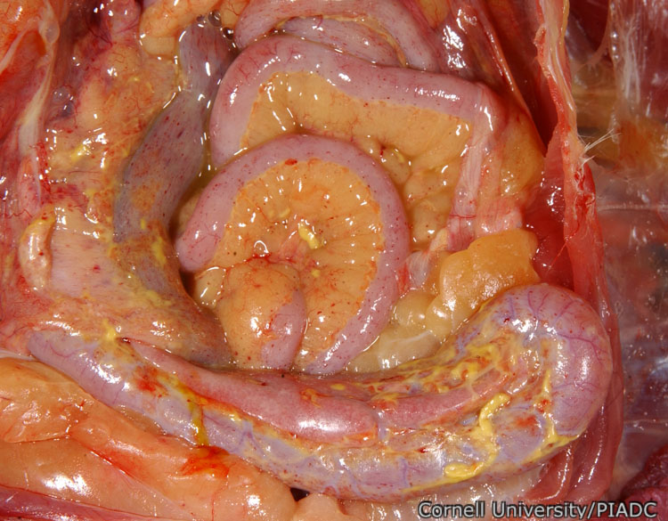 La peritonitis por yema de huevo suele diagnosticarse por necropsia, ya que habitualmente pasa desapercibido por los criadores. Suele afectar aves de criaderos, especialmente especies pequeñas que no son habitualmente manipuladas y la sintomatología que ocasiona es inespecífica y muchas veces acaba en una muerte súbita del ave. En la necrospia podemos observar desde signos leves (presencia de material amarillento entre los órganos abdominales) hasta una ascitis extensa, con liquido serosanguinolento y alteración de las vísceras por la sepsis.