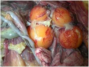 La peritonitis por yema de huevo es una condición relativamente frecuente en hembras reproductoras y una de las principales causas de distensión abdominal. A pesar de que el material de la yema puede ser reabsorbido por el cuerpo tras un leve proceso inflamatorio, puede constituir también un caldo de cultivo para bacterias dando un cuadro de peritonitis secundaria con crecimiento bacteriano. Esto puede derivar en una ascitis y un compromiso de los órganos abdominales.