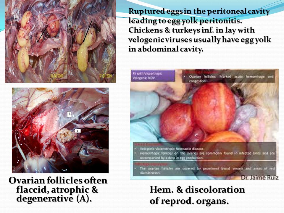 Esta patología también es sumamente frecuente en gallinas ponedoras. Suele estar asociado a un exceso de folículos, ovulaciones erráticas y suele ir acompañado de huevos con doble yema y prolapsos de oviducto. Se cree que hay un componente genético en ello aunque puede evitarse limitando la estimulación lumínica de las aves jóvenes y bajas de peso y no teniendo a las aves excesivamente gordas cuando son adultas.