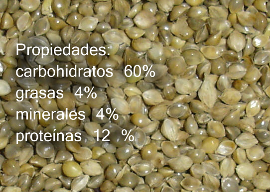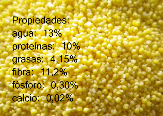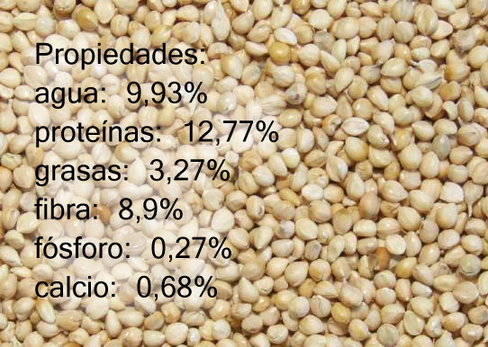 contiene más grasas que los otros dos mijos anteriores y por su dureza es más difícil de pelar. Es un buen complemento para nuestros estrílidos, pero sin abusar de su uso en su dieta diaria.
